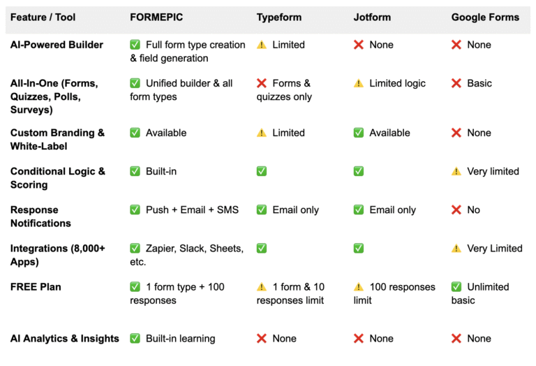 FORMEPIC combines the ease of Google Forms, the beauty of Typeform, and the power of Jotform, then adds AI intelligence none of them have. Experience the difference yourself