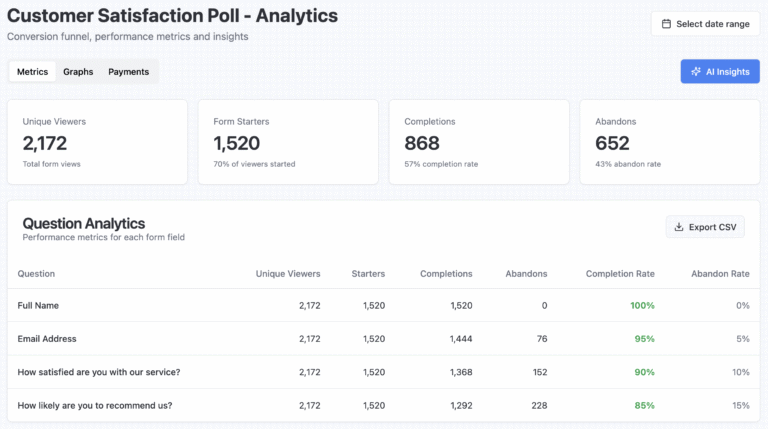 📊 Smart Insights Built-In — Track completions, drop-offs & engagement automatically, then analyze using AI